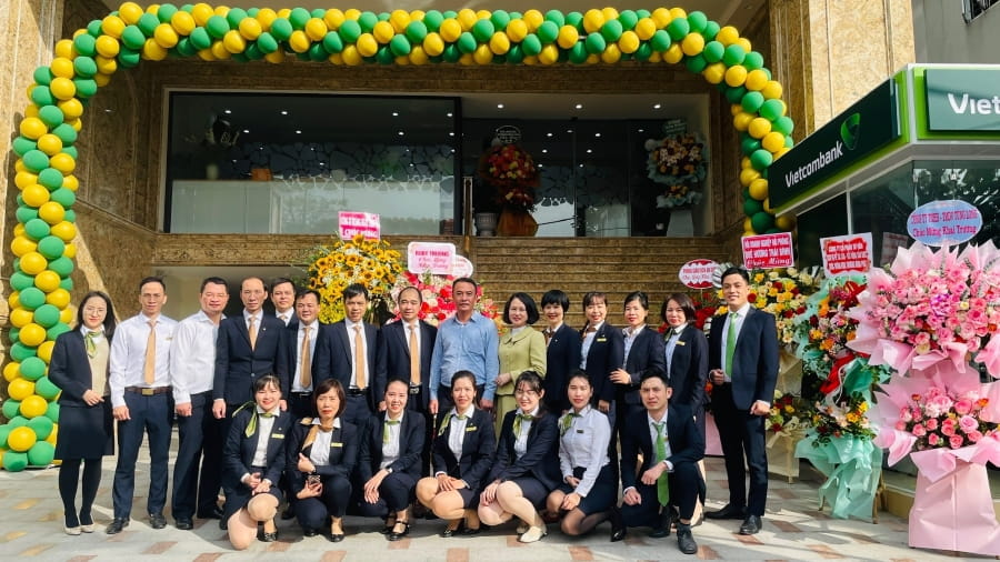 Ban Giám đốc Vietcombank Nam Hải Phòng cùng lãnh đạo các phòng thuộc chi nhánh chúc mừng khai trương PGD Ngô Quyền