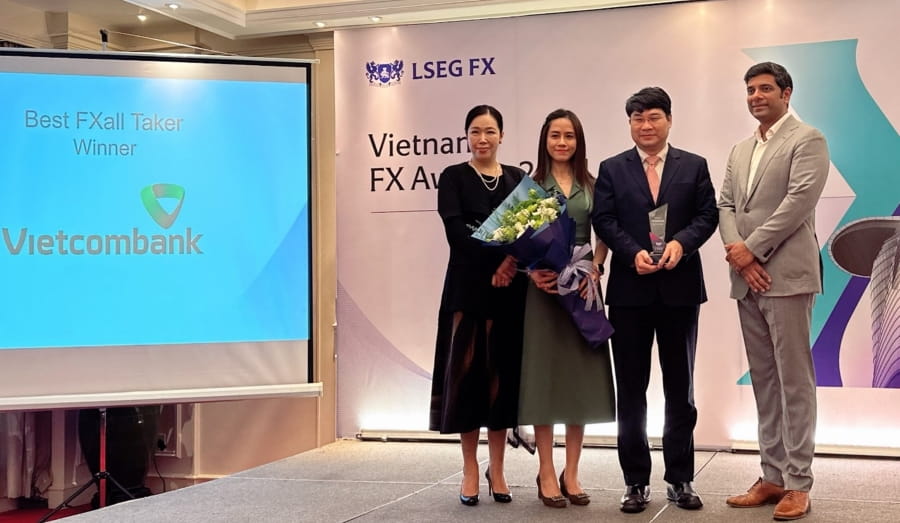 Ngày 22/3/2024, tại Hà Nội đã diễn ra Lễ trao giải LSEG Vietnam FX Awards 2024 do Tập đoàn giao dịch chứng khoán London (LSEG) tổ chức. Tại buổi lễ, Vietcombank đã vinh dự được trao tặng danh hiệu Best FXall Taker - Ngân hàng có khối lượng giao dịch ngoại tệ trên FXall lớn nhất tại Việt Nam trong năm 2023. FXall là hệ thống giao dịch chính thức của thị trường ngoại hối Việt Nam để giao dịch ngoại tệ trên thị trường quốc tế theo hình thức khớp giá tự động. Giải thưởng được trao dựa trên số liệu thống kê của LSEG về giao dịch của các thành viên trên hệ thống này.