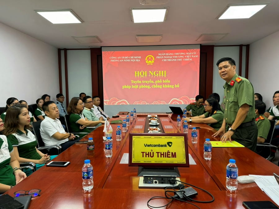 Ngày 06/4/2024, Vietcombank Thủ Thiêm phối hợp với Phòng an ninh nội địa Công an Tp. HCM tổ chức tuyên truyền, phổ biến pháp luật phòng, chống khủng bố cho CBNV và đội ngũ bảo vệ tại trụ sở chi nhánh.