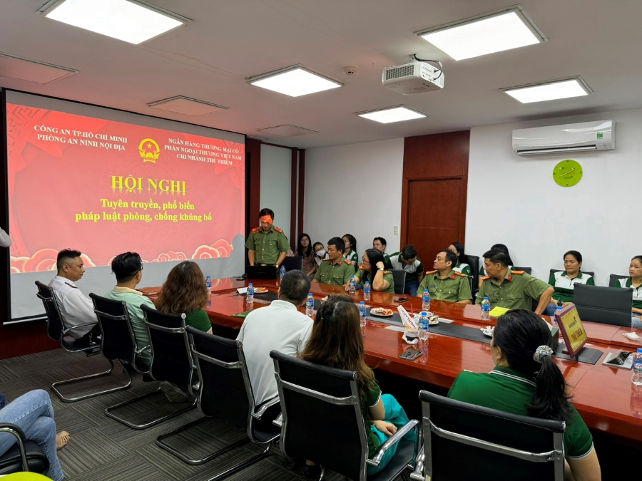Nội dung tuyên tuyền, phổ biến pháp luật phòng, chống khủng bố nhằm trang bị CBNV kiến thức và nâng cao ý thức trách nhiệm, tinh thần cảnh giác cho các phòng ban, CBNV Vietcombank Thủ Thiêm trong công tác đấu tranh phòng, chống khủng bố, tài trợ khủng bố. Đại diện Công an thành phố Hồ Chí Minh đã nêu một số trường hợp khủng bố xảy ra khu vực thành phố, đồng thời hướng dẫn một số quy trình khi gặp tình huống lợi dụng chuyển tiền qua hệ thống ngân hàng để tài trợ cho khủng bố, bắt cóc con tin…