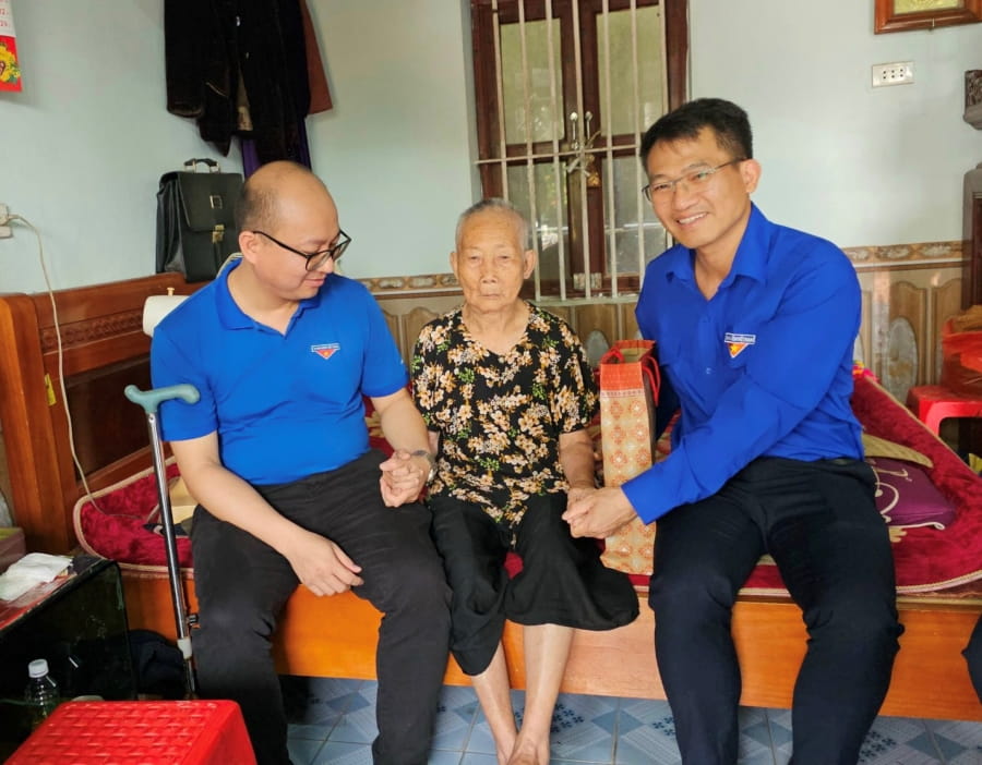 Đồng chí Nguyễn Văn Thịnh - Phó Giám đốc Vietcombank Hưng Yên và đồng chí Dương Bảo Trung - Bí thư Đoàn Thanh niên Vietcombank trao quà cho người có công với cách mạng, gia đình chính sách, mẹ Việt Nam anh hùng tại địa phương