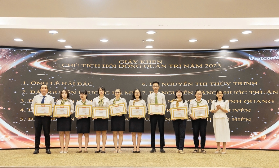 Bà Nguyễn Thị Lan Hương - Phó Giám đốc Vietcombank Đà Nẵng (bìa phải) trao Giấy khen của Chủ tịch HĐQT năm 2023 cho ông Lê Hải Bắc - Phó Giám đốc, Phó Chủ tịch Công đoàn Vietcombank Đà Nẵng (bìa trái) và các cán bộ nhân viên được khen thưởng