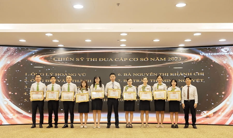 Ông Đặng Ngọc Bửu Quỳnh - Phó Bí thư Đảng ủy, Phó Giám đốc, Chủ tịch Công đoàn Vietcombank Đà Nẵng (bìa phải) trao Giấy khen Chiến sĩ thi đua cấp cơ sở năm 2023 cho ông Lý Hoàng Vũ, Bí thư Đảng ủy, Giám đốc Vietcombank Đà Nẵng (thứ 6 từ trái qua) và các cán bộ nhân viên được khen thưởng