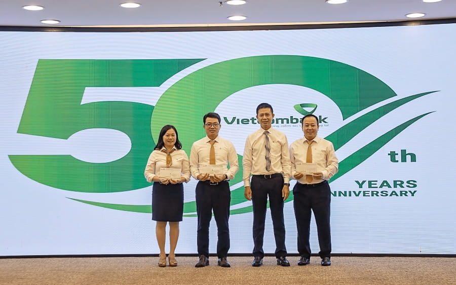 Ông Lý Hoàng Vũ - Bí thư Đảng ủy, Giám đốc Vietcombank Đà Nẵng (thứ hai từ phải qua) trao thưởng cho tập thể các phòng đã hoàn thành xuất sắc công trình trong đợt đăng ký thi đua chào mừng 50 năm thành lập Chi nhánh - giai đoạn 1