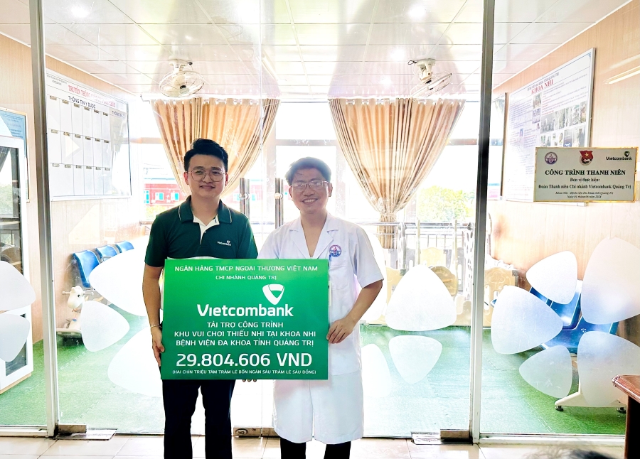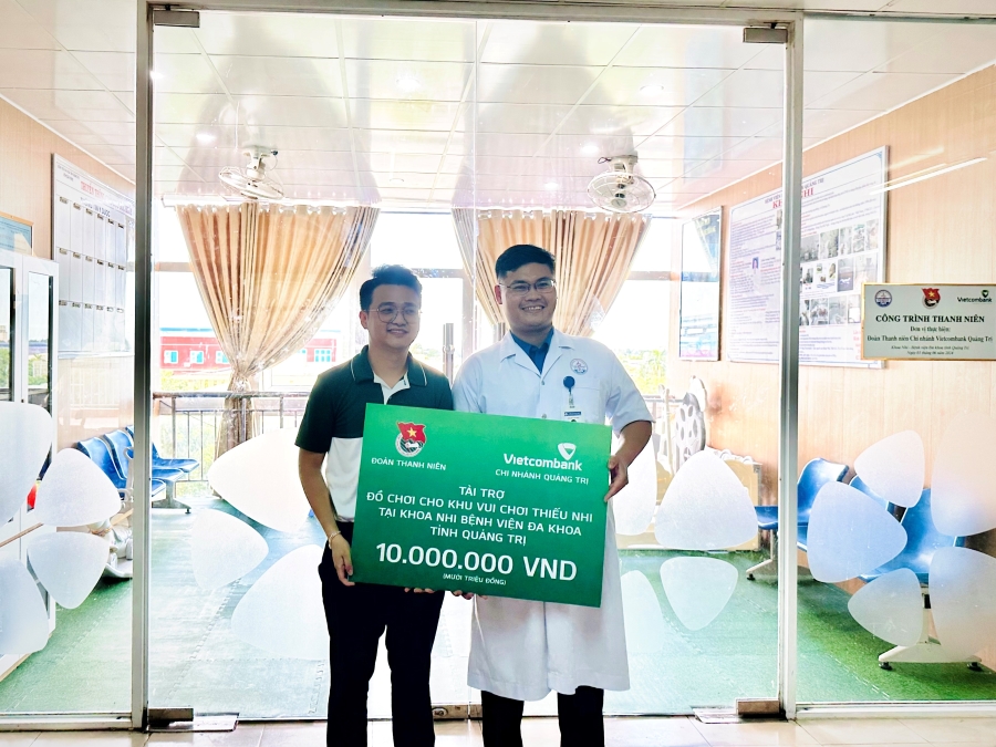 Anh Nguyễn Xuân Ngọc Phúc - Bí thư Đoàn cơ sở Vietcombank Quảng Trị đại diện Vietcombank Quảng Trị trao biển tài trợ trị giá ~30.000.000 VND cho lãnh đạo khoa Nhi - Bệnh viện Đa khoa tỉnh Quảng Trị.