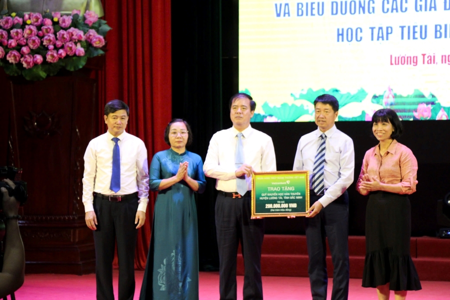 Ông Lê Nho Ích - Bí thư Chi bộ, Giám đốc Vietcombank Kinh Bắc (thứ 2 từ phải sang) và bà Nguyễn Thị Kim Chung - Phó giám đốc, Chủ tịch công đoàn (thứ 1 từ phải sang) đại diện Vietcombank Kinh Bắc trao tài trợ 200 triệu đồng cho Quỹ khuyến học Hàn Thuyên, huyện Lương Tài.