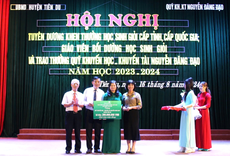 Nhân dịp này, Vietcombank Kinh Bắc đã tài trợ 600 triệu đồng cho 3 Quỹ khuyến học thuộc huyện Tiên Du, huyện Lương Tài và thành phố Từ Sơn (mỗi quỹ 200 triệu đồng), góp phần động viên, khích lệ tinh thần thi đua học tốt, dạy tốt của các thầy cô giáo và các học sinh nơi đây.