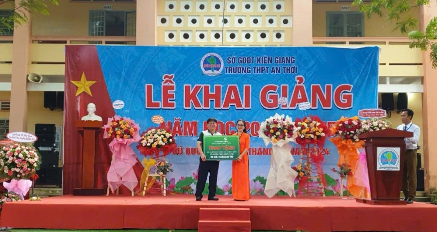 Đại diện Vietcombank Phú Quốc, ông Trần Quốc Khánh - Trưởng phòng Kế toán (bên trái) trao tặng bảng tài trợ tại Trường THPT An Thới
