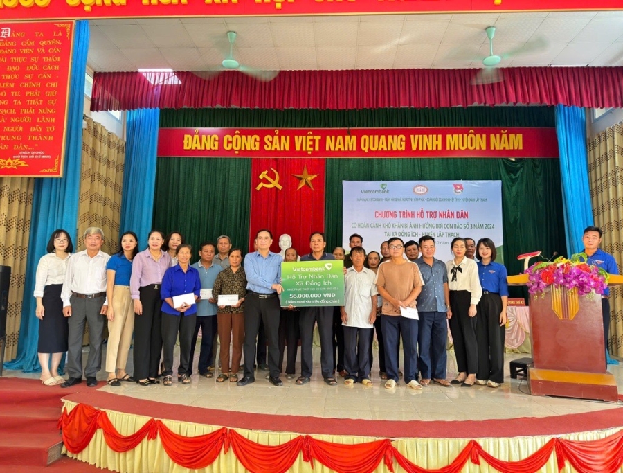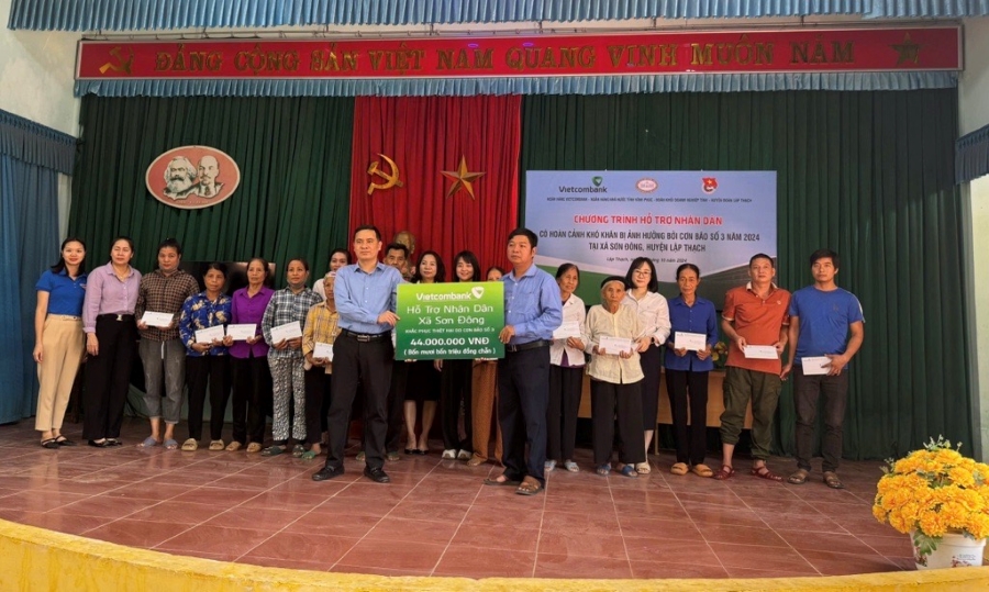 Sáng 03/10/2024, Vietcombank Vĩnh Phúc đã lập đoàn công tác với sự tham gia cùng của đại diện Ngân hàng Nhà nước, Đoàn khối doanh nghiệp tỉnh Vĩnh Phúc đến thăm và trao tặng tổng số tiền 100 triệu đồng để hỗ trợ khắc phục hậu quả cơn bão số 3 gây ra cho người dân tại địa bàn xã Sơn Đông và xã Đồng Ích; thăm hỏi và hỗ trợ đình anh Trần Văn Thái bị ảnh hưởng nặng thuộc huyện Lập Thạch, tỉnh Vĩnh Phúc.
