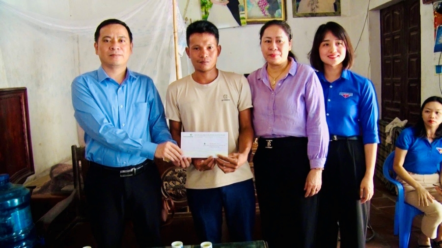 Ông Đỗ Minh Phượng - Phó Giám đốc Phụ trách điều hành Chi nhánh cùng bà Phạm Thị Kim Dung - Ủy viên BCH Công đoàn NHNN và bà Trần Thị Thu Hương - Bí thư đoàn khối doanh nghiệp tỉnh Vĩnh Phúc trao quà cho gia đình anh Trần Văn Thái