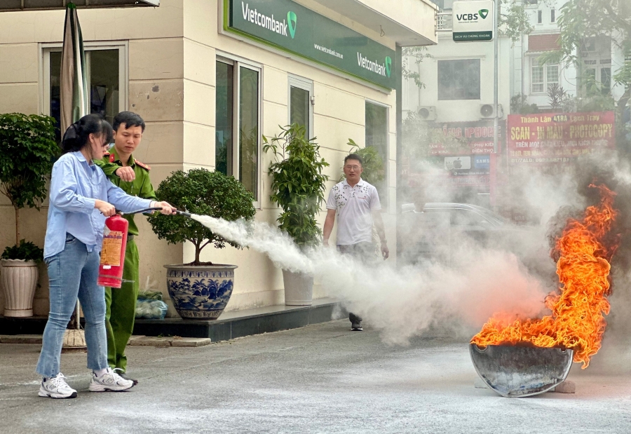 Cán bộ chi nhánh thực hành diễn tập phòng cháy, chữa cháy tại trụ sở Vietcombank Hải Phòng