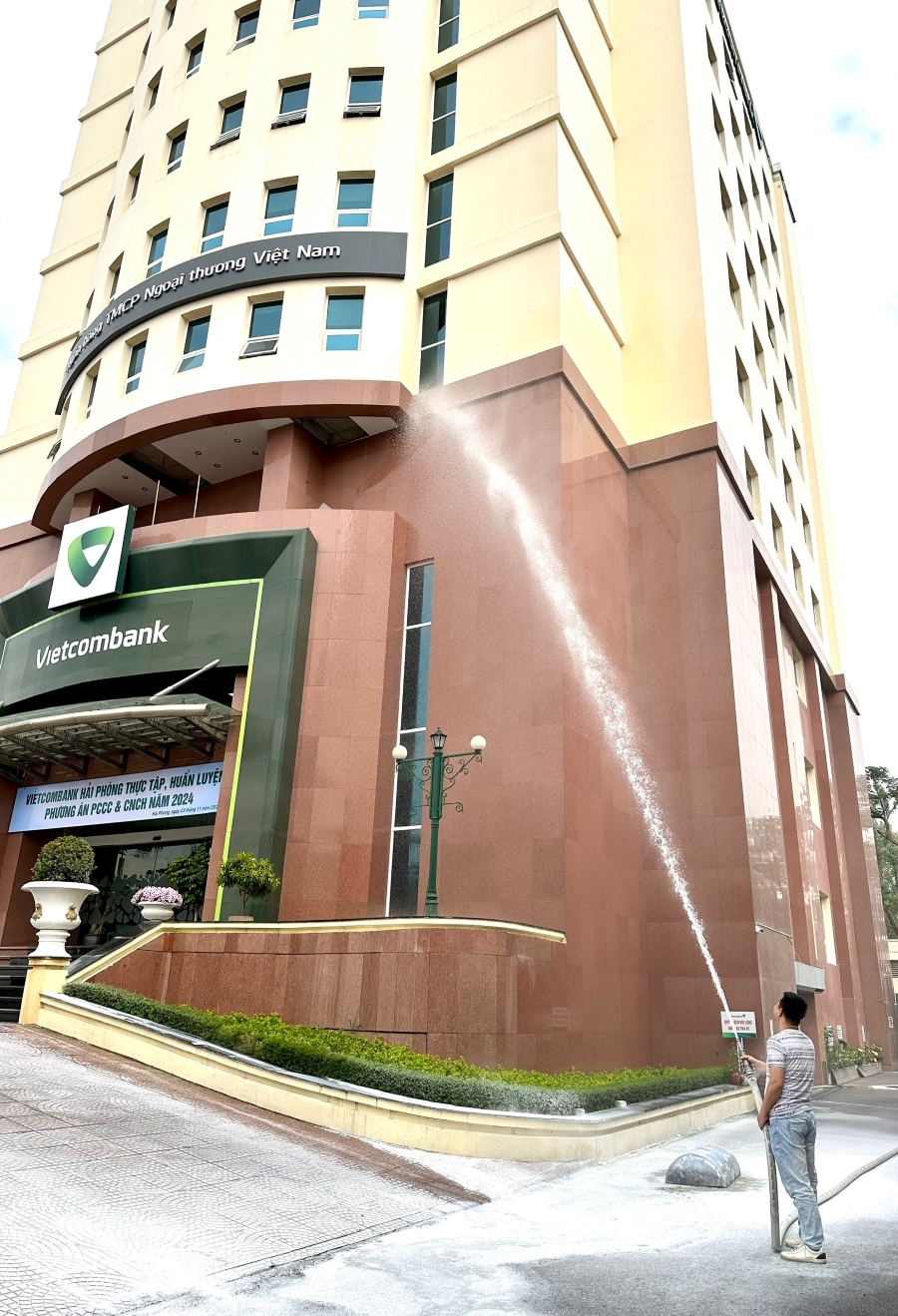 Đội PCCC cơ sở Vietcombank Hải Phòng diễn tập sử dụng vòi nước chữa cháy trên cao