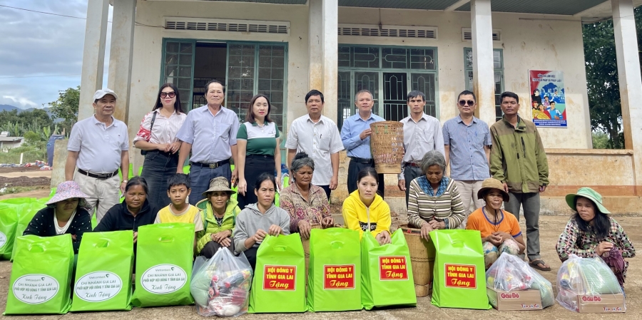 Bà Ksor Huệ - Phó Trưởng phòng phụ trách phòng Kế toán Vietcombank Gia Lai (thứ 4 từ trái sang) và bác sĩ Nguyễn Thanh Hùng - Chủ tịch Hội Đông y tỉnh Gia Lai (thứ 5 từ trái sang) cùng đại diện các mạnh thường quân trao tặng quà cho bà con tại làng Bluk Blui, xã Ia Kha, huyện Chư Păh, tỉnh Gia Lai.