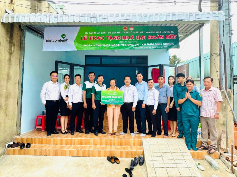 Phát huy truyền thống “lá lành đùm lá rách”, hưởng ứng phong trào “Cả nước chung tay vì người nghèo - Không để ai bị bỏ lại phía sau”, sáng ngày 13/12/2024, Vietcombank Nam Bình Dương phối hợp với UBND phường Hội Nghĩa tổ chức trao tặng 2 ngôi nhà đại đoàn kết cho gia đình bà Đồng Thị Thanh và bà Tăng Thị Hồng Đào là 2 hộ có hoàn cảnh đặc biệt khó khăn về nhà ở trên địa bàn phường. Vietcombank Nam Bình Dương đã hỗ trợ, khởi công xây dựng nhà mới cho bà Tăng Thị Hồng Đào, diện tích 60,75m2 và bà Đồng Thị Thanh, diện tích 50m2 với tổng giá trị 200 triệu đồng.