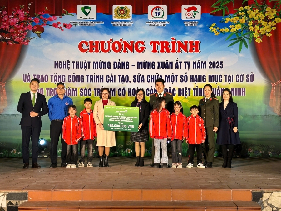 Hoà chung không khí Tết Ất Tỵ đang cận kề, ngày 13/01/2025, tại Cơ sở bảo trợ chăm sóc trẻ em có hoàn cảnh đặc biệt tỉnh Quảng Ninh, Vietcombank Quảng Ninh đã tới tham dự chương trình nghệ thuật mừng Đảng, mừng xuân Ất Tỵ 2025. Bà Vũ Vân Anh - Chủ tịch CĐCS, Phó Giám đốc Vietcombank Quảng Ninh đã trao tặng Công trình cải tạo, sửa chữa một số hạng mục tại cơ sở Bảo trợ chăm sóc trẻ em có hoàn cảnh đặc biệt tỉnh Quảng Ninh" với tổng giá trị 495 triệu đồng. Vietcombank Quảng Ninh tin tưởng rằng cơ sở bảo trợ sau khi được cải tạo sẽ mang lại môi trường sinh hoạt, học tập khang trang, thuận lợi hơn cho các em, thắp lên tình yêu thương và niềm tin tươi sáng, tiếp bước và chắp cánh cho ước mơ của các em bay xa.