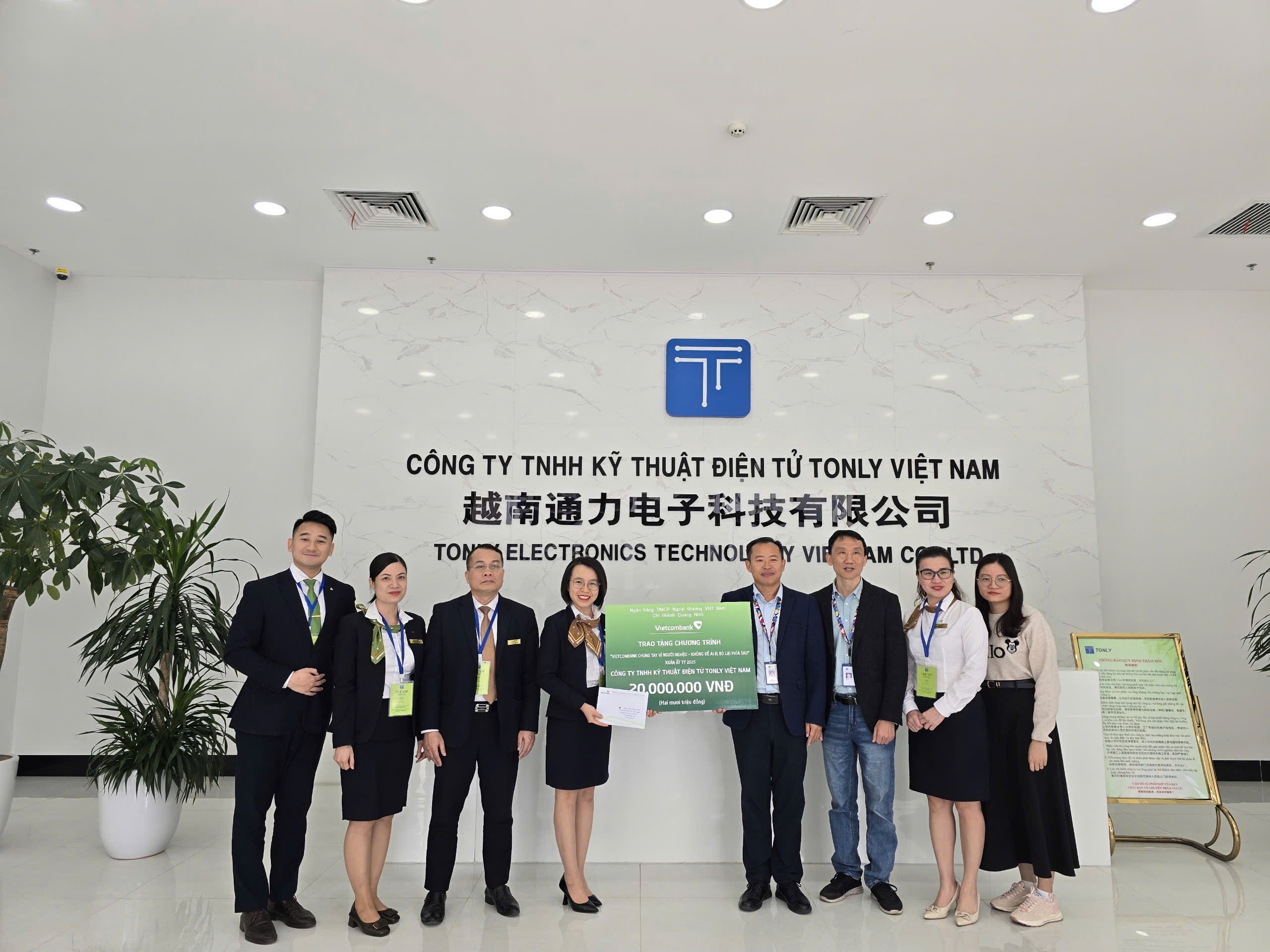 Bà Lê Thị Tâm - Phó Trưởng phòng Khách hàng Doanh nghiệp, Vietcombank Quảng Ninh (thứ 4 từ trái sang) trao tặng quà cho công nhân lao động Công ty TNHH Kỹ thuật Điện tử TONLY Việt Nam