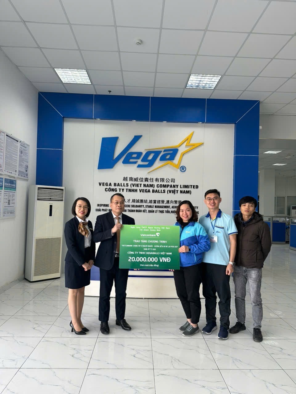 Ông Nguyễn Văn Cẩn - Trưởng phòng Giao dịch Cao Thắng, Vietcombank Quảng Ninh (thứ 2 từ trái sang) trao tặng quà cho công nhân lao động Công ty TNHH VEGA Balls (Việt Nam)