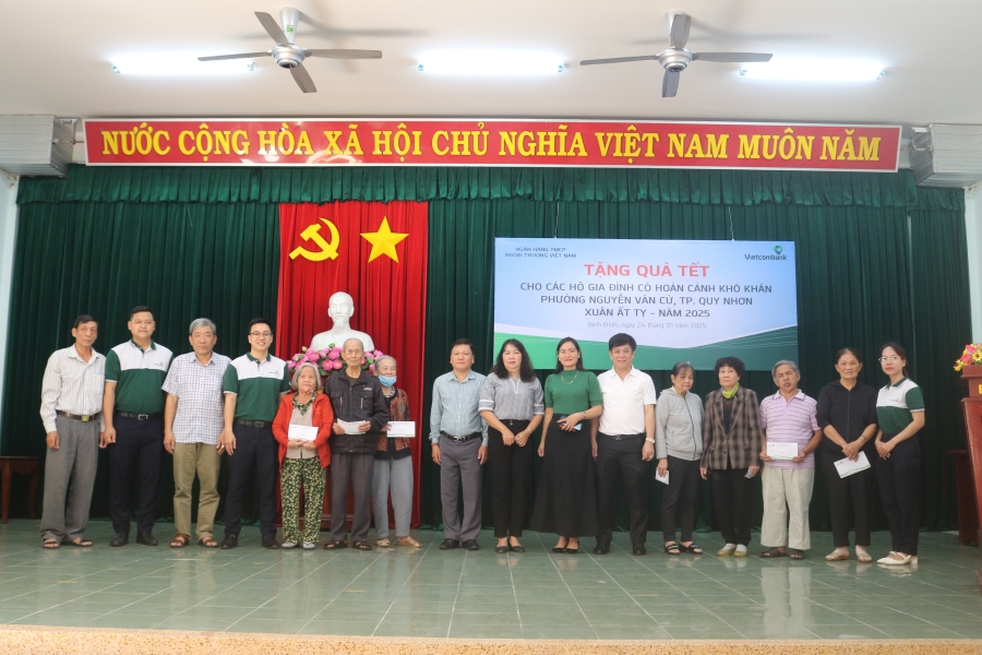 Trong dịp này, Vietcombank Bình Định cũng đã đến trao tặng 129 suất quà, mỗi suất trị giá 500 nghìn đồng cho các hộ nghèo tại các địa bàn phường, gồm: phường Hoài Xuân, thị xã Hoài Nhơn, tỉnh Bình Định (36 suất); phường Nguyễn Văn Cừ, thành phố Quy Nhơn, tỉnh Bình Định (40 suất); phường Quang Trung, thành phố Quy Nhơn, tỉnh Bình Định (53 suất).