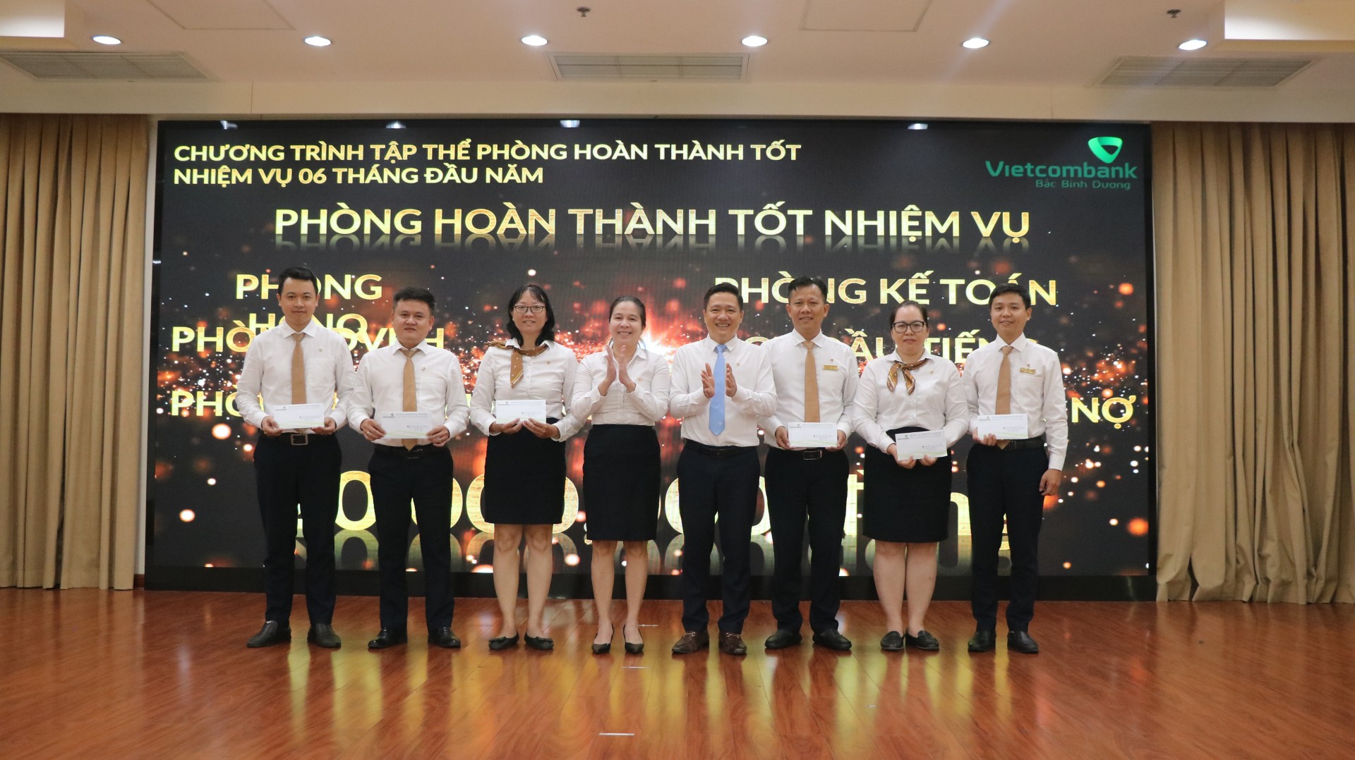 Ông Nguyễn Khánh Thắng - Bí thư Chi bộ, Giám đốc chi nhánh (thứ 4 từ bên phải qua) và bà Đỗ Thùy Trang - Phó Bí thư Chi bộ, Chủ tịch Công đoàn cơ sở, Phó Giám đốc chi nhánh (thứ 4 từ bên trái qua) trao thưởng cho tập thể các phòng hoàn thành tốt nhiệm vụ kinh doanh 6 tháng đầu năm 2025
