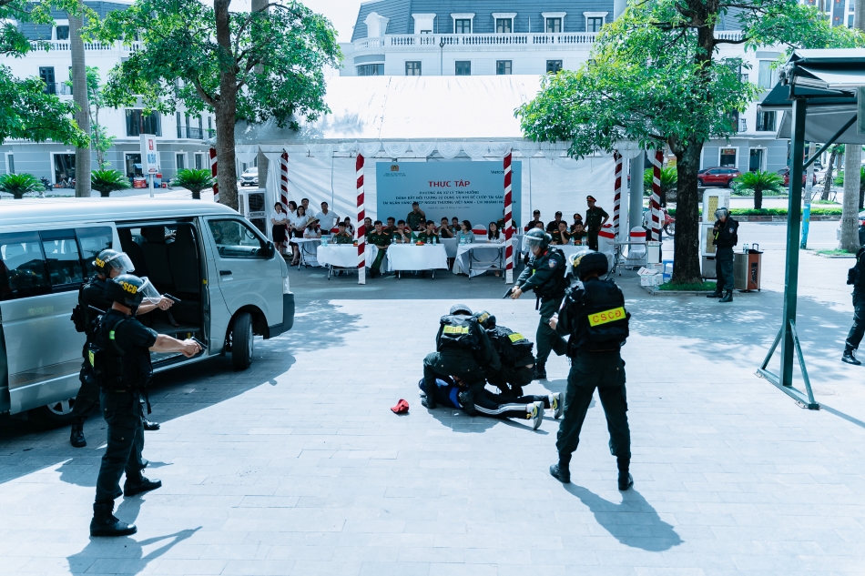 Sau hội nghị là chương trình diễn tập thực tế tại trụ sở chi nhánh với tình huống giả định cướp ngân hàng có vũ trang. Theo đó, một nhóm đối tượng giả định xâm nhập trụ sở ngân hàng, uy hiếp nhân viên và khách hàng. Lực lượng bảo vệ nội bộ phối hợp với công an địa phương triển khai phương án khống chế, giải cứu con tin và bảo vệ tài sản.