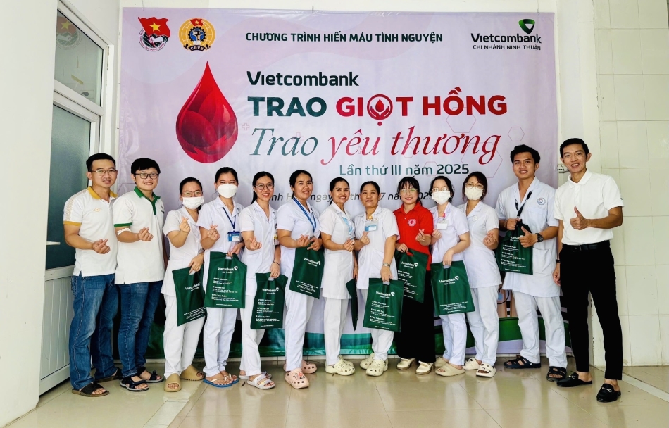 Chương trình “Trao giọt hồng - Trao yêu thương” là chuỗi hoạt động thường niên của Vietcombank. Mỗi giọt máu hồng cho đi là một nghĩa cử cao đẹp, một sự sẻ chia vô cùng quý giá để cứu sống những người bệnh cần máu. Tinh thần nhân ái và trách nhiệm với cộng đồng luôn là giá trị mà Vietcombank Ninh Thuận hướng tới.