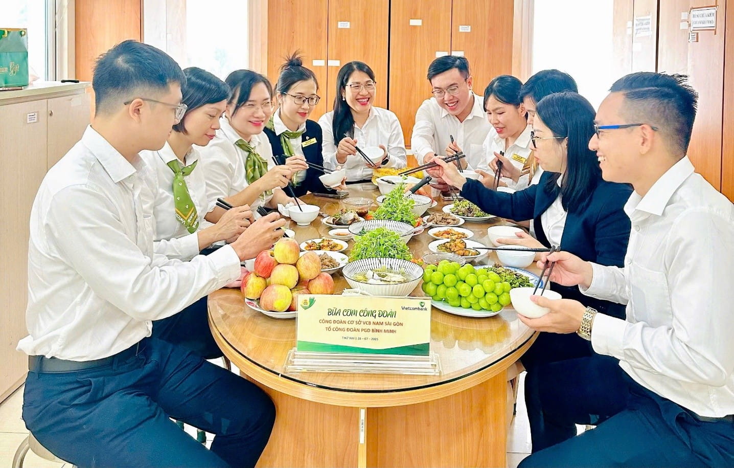 100% Tổ Công đoàn trực thuộc CĐCS Vietcombank Nam Sài Gòn đã tổ chức thành công “Bữa cơm Công đoàn” với sự hưởng ứng tham gia nhiệt tình và tinh thần phấn khởi của toàn thể đoàn viên, người lao động. Các bữa cơm trưa được tổ chức giản dị nhưng chu đáo trong không khí đầm ấm, vui tươi. Các món ăn được lựa chọn kỹ, thực đơn cân đối, đầy đủ các nhóm dưỡng chất cần thiết, bảo đảm các tiêu chí an toàn vệ sinh, tiết kiệm và ý nghĩa.