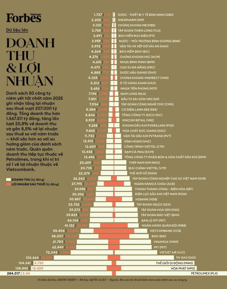 Đây là danh sách thường niên lần thứ 13 được Forbes Việt Nam xếp hạng dựa trên báo cáo tài chính kiểm toán hợp nhất của các doanh nghiệp đang niêm yết trên Sở Giao dịch Chứng khoán TP.HCM (HSX) và sở Giao dịch Chứng khoán Hà Nội (HNX). Tổng thu của 50 doanh nghiệp trong danh sách năm 2025 đạt khoảng 1.567.511 tỷ đồng, tăng 20,8% so với năm trước. Lợi nhuận sau thuế đạt trên 207.000 tỷ đồng, tăng 8,5%. Kết quả này cho thấy sự trở lại mạnh mẽ của các doanh nghiệp niêm yết trong bối cảnh nền kinh tế phục hồi tích cực sau giai đoạn biến động, đặc biệt là các doanh nghiệp đầu ngành có nền tảng tài chính vững chắc và chiến lược phát triển dài hạn.
