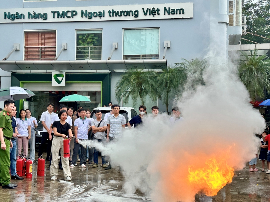 Cán bộ nhân viên Vietcombank Nam Hà Nội thực hành sử dụng thiết bị bình chữa cháy