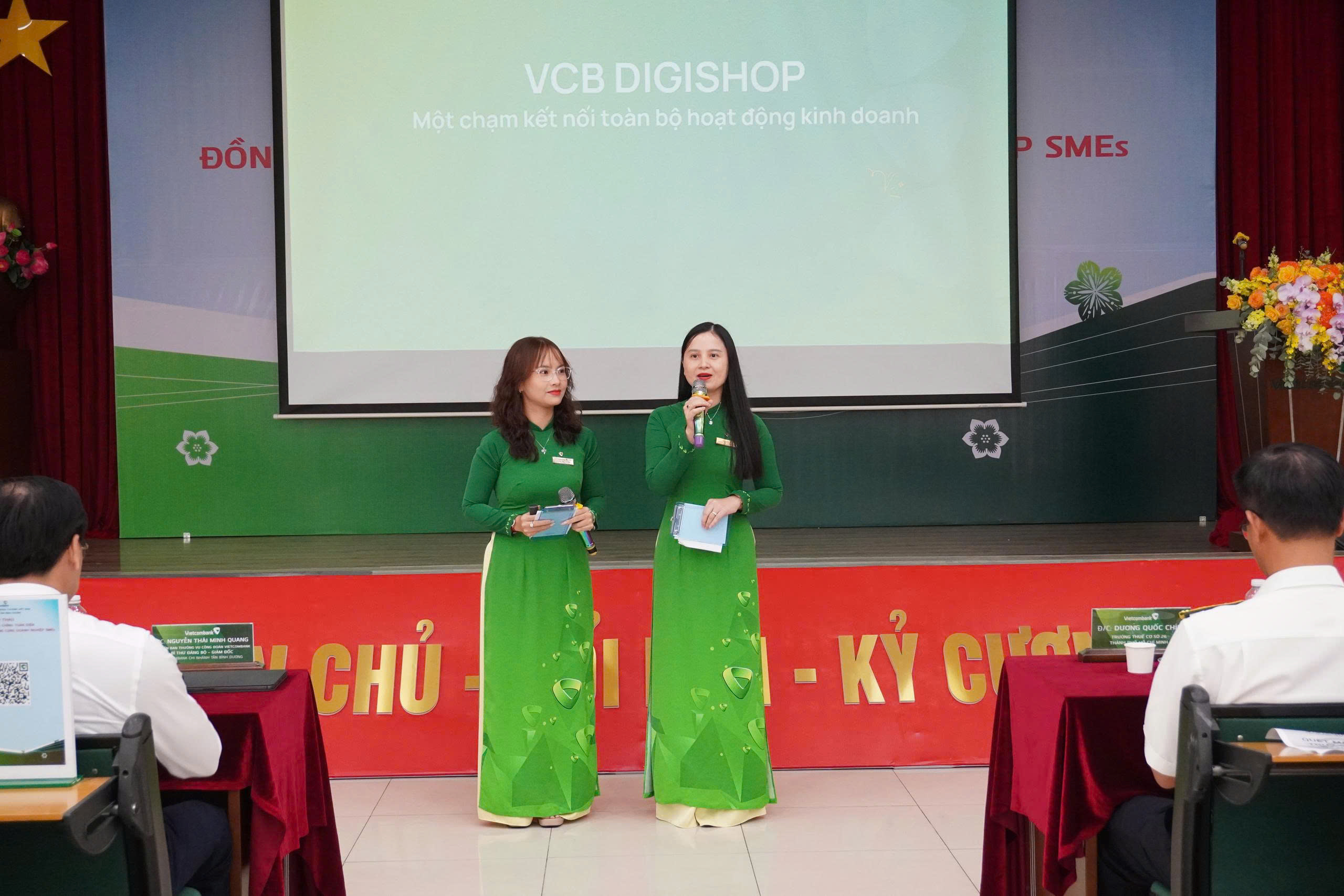 Tiếp nối chương trình, Vietcombank Tân Bình Dương giới thiệu hệ sinh thái giải pháp tài chính toàn diện dành cho doanh nghiệp SME. Đại diện Phòng Khách hàng bán lẻ trình bày các gói vay vốn ưu đãi với lãi suất cạnh tranh, chỉ từ 4,6%/năm đối với khoản vay lưu động và từ 5,5%/năm cho vay trung dài hạn. Đặc biệt, bộ giải pháp VCB Digishop do Phòng Dịch vụ khách hàng giới thiệu đã nhận được sự quan tâm lớn từ các doanh nghiệp. Đây là công cụ tích hợp đa chức năng, hỗ trợ doanh nghiệp trong giao dịch ngân hàng, quản lý bán hàng, phát hành hóa đơn điện tử và thanh toán thuế, góp phần thúc đẩy chuyển đổi số hiệu quả.