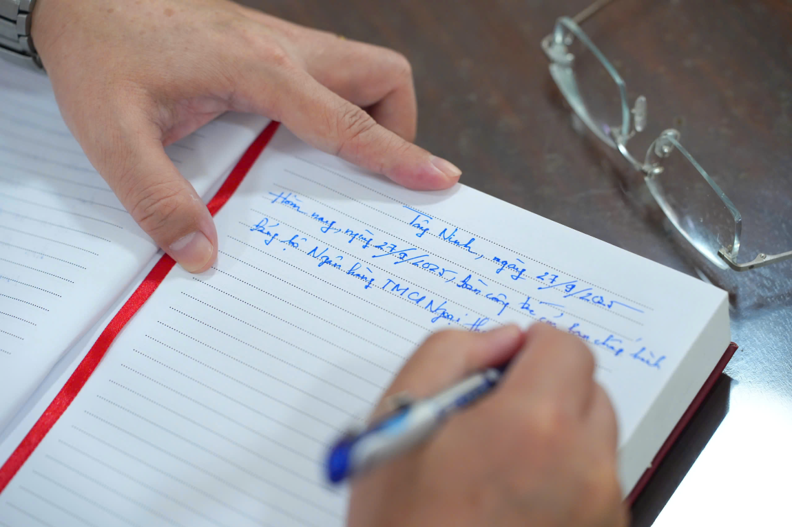 Đ/c Nguyễn Thanh Tùng - Uỷ viên BCH Đảng bộ Chính phủ, Bí thư Đảng ủy, Chủ tịch HĐQT - Trưởng đoàn công tác Đảng bộ Vietcombank trân trọng ghi lại những cảm xúc sâu sắc trong sổ cảm tưởng sau chuyến tham quan ý nghĩa và đầy tự hàoĐoàn công tác Đảng bộ Vietcombank chụp hình lưu niệm tại khu di tích