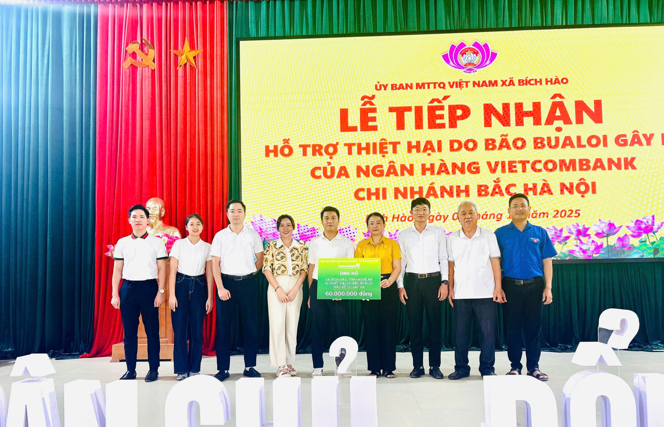 Ngày 08/10/2025, tại UBND xã Bích Hào, tỉnh Nghệ An, ông Nguyễn Tuấn Hùng - Phó Chủ tịch CĐCS Vietcombank Bắc Hà Nội đại diện chi nhánh trao số tiền ủng hộ 60 triệu đồng đến Ủy ban MTTQ xã và 05 trường học bị tổn thất nặng nề để hỗ trợ cho công tác khắc phục hậu quả do cơn bão số 10 gây ra trên địa bàn xã.