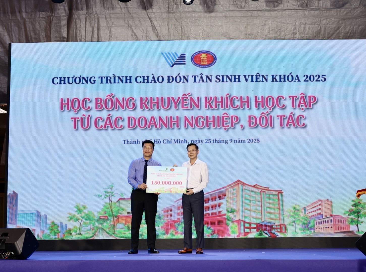 Ông Nguyễn Chí Linh - Giám đốc Vietcombank Tân Sơn Nhất (bên phải) trao biển tượng trưng tài trợ cho đại diện Trường Đại học Khoa học Xã hội và Nhân văn