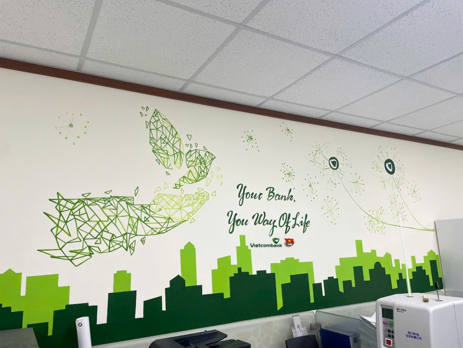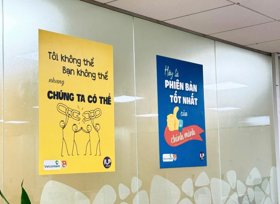 Khu vực làm việc được bổ sung thêm các khẩu hiệu lan tỏa tinh thần tích cực của tuổi trẻ Vietcombank khắp hệ thống