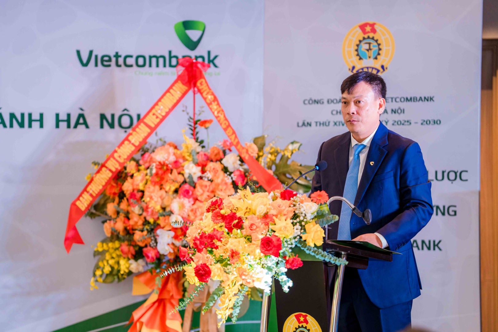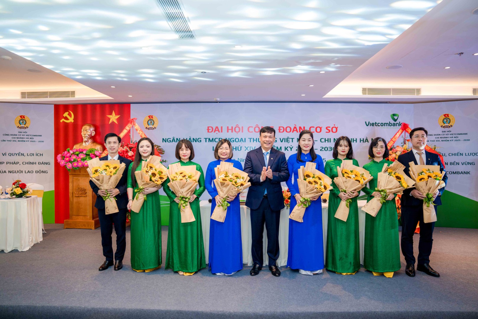 Đ/c Lê Ngọc Thái - Giám đốc Vietcombank Hà Nội tặng hoa chúc mừng các đồng chí trúng cử Ban Chấp hành Công đoàn khóa XIV nhiệm kỳ 2025-2030
