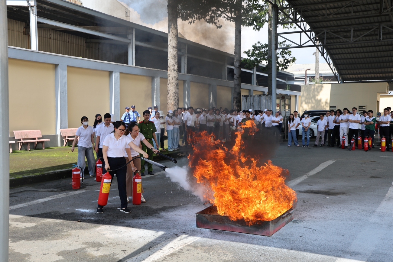 Bên cạnh phần lý thuyết, chương trình huấn luyện thực hành được triển khai trực tiếp tại sân cơ quan. Cán bộ PCCC hướng dẫn chi tiết cách kiểm tra, sử dụng bình chữa cháy, thao tác dập lửa đúng kỹ thuật cùng với phần thực hành triển khai vòi chữa cháy và thao tác phun nước áp lực để mô phỏng các tình huống xử lý sự cố thực tế. Cán bộ nhân viên tham gia thực hành nghiêm túc, chủ động phối hợp, qua đó rèn luyện phản xạ xử lý tình huống khi xảy ra cháy nổ trong thực tế.