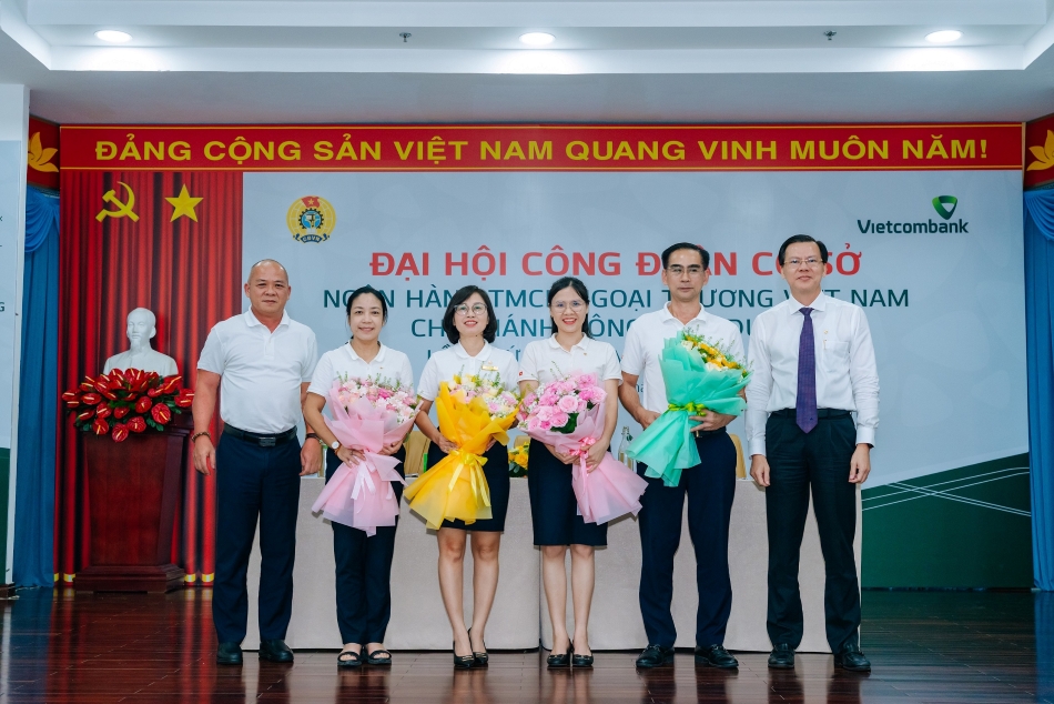 Ông Nguyễn Thái Minh Quang - UV BTV Công đoàn Vietcombank, Giám đốc Vietcombank Tân Bình Dương (ngoài cùng bên phải) và ông Nguyễn Xuân Giang - Bí thư chi bộ, Giám đốc Vietcombank Đông Bình Dương (ngoài cùng bên trái) tặng hoa chúc mừng BCH Công đoàn cơ sở nhiệm kỳ 2025-2030