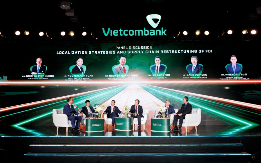 Trong phiên tọa đàm về cơ hội nội địa hóa và tái cấu trúc chuỗi cung ứng, đại diện Cục Đầu tư Nước ngoài - Bộ Tài chính, VCCI, KoCham, PPJ Group và Panasonic Appliances Việt Nam đã cùng thảo luận dưới sự điều phối của Phó Tổng Giám đốc Vietcombank Nguyễn Việt Cường. Tại đây, nhiều vấn đề trọng tâm được trao đổi như xu hướng dịch chuyển chuỗi cung ứng, khả năng tận dụng cơ hội nội địa hóa của doanh nghiệp Việt Nam và giải pháp hỗ trợ từ hệ sinh thái tài chính – ngân hàng.