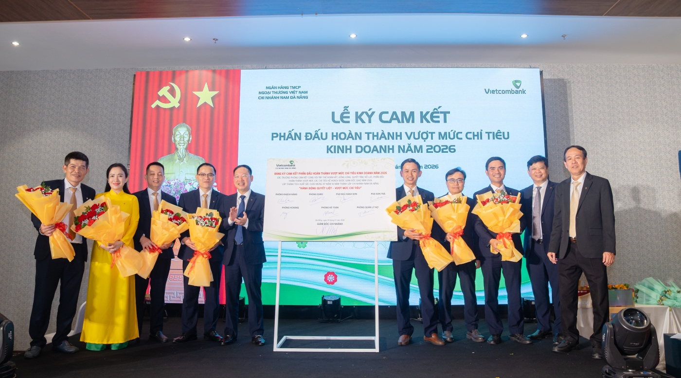 Trong phần triển khai nhiệm vụ kinh doanh năm 2026, Ban Giám đốc cùng các Trưởng phòng đã thể hiện quyết tâm cao trong việc hoàn thành vượt mức các chỉ tiêu kinh doanh được giao thông qua lễ ký cam kết thi đua. Với khẩu hiệu “hành động quyết liệt - vượt mức chỉ tiêu”, tập thể lãnh đạo và cán bộ chủ chốt Vietcombank Nam Đà Nẵng khẳng định tinh thần chủ động, trách nhiệm và đồng lòng thực hiện thắng lợi nhiệm vụ kinh doanh năm 2026.