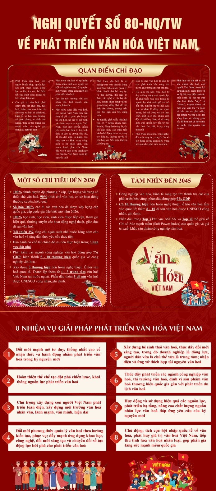 Ngày 07/01/2026, Bộ Chính trị ban hành Nghị quyết số 80-NQ/TW về phát triển văn hóa Việt Nam trong kỷ nguyên mới. Nghị quyết khẳng định văn hóa là nền tảng tinh thần của xã hội, là nguồn lực nội sinh quan trọng, động lực và hệ điều tiết cho phát triển nhanh, bền vững đất nước.