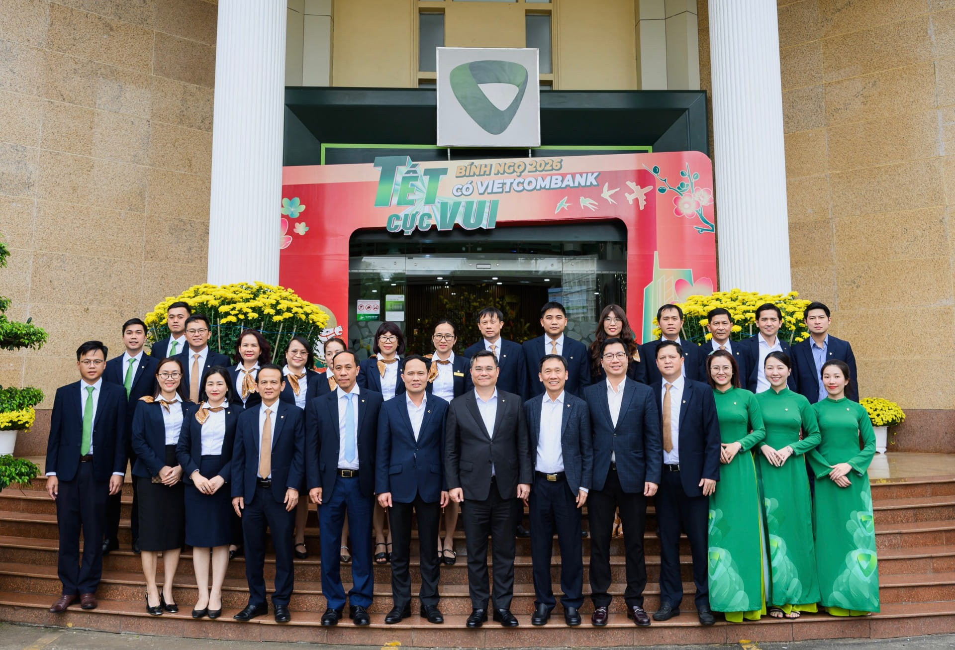 Đồng chí Nguyễn Thanh Tùng - Ủy viên Ban chấp hành Đảng bộ Chính phủ, Bí thư Đảng ủy, Chủ tịch Hội đồng quản trị Vietcombank (hàng đầu, đứng giữa) chụp ảnh kỷ niệm cùng tập thể Vietcombank Đắk Lắk