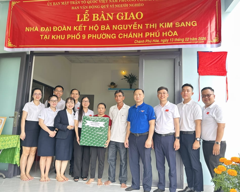 Ngày 13/02/2026, trong không khí rộn ràng của mùa xuân mới, Vietcombank Bình Dương đã tổ chức lễ trao tặng nhà đại đoàn kết cho gia đình bà Nguyễn Thị Kim Sang (sinh năm 1984) tại khu phố 9, phường Chánh Phú Hòa, TP. Hồ Chí Minh.