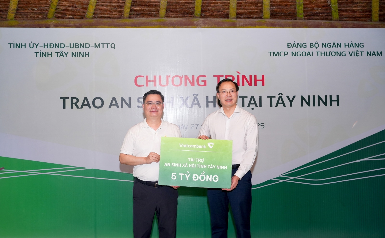 Đồng chí Nguyễn Thanh Tùng – Ủy viên Ban Chấp hành Đảng bộ Chính phủ, Bí thư Đảng ủy, Chủ tịch HĐQT Vietcombank (bên trái) trao bảng tượng trưng kinh phí 5 tỷ đồng tài trợ an sinh xã hội tỉnh Tây Ninh