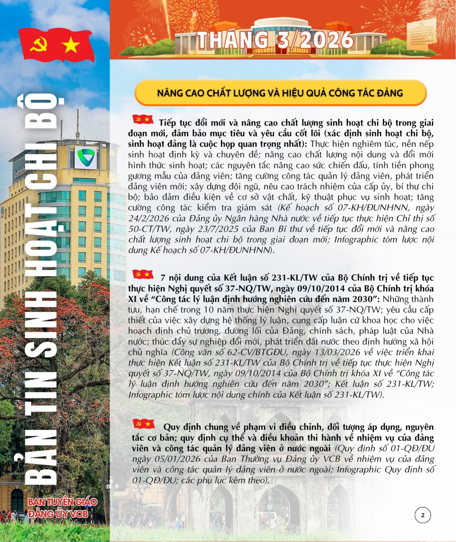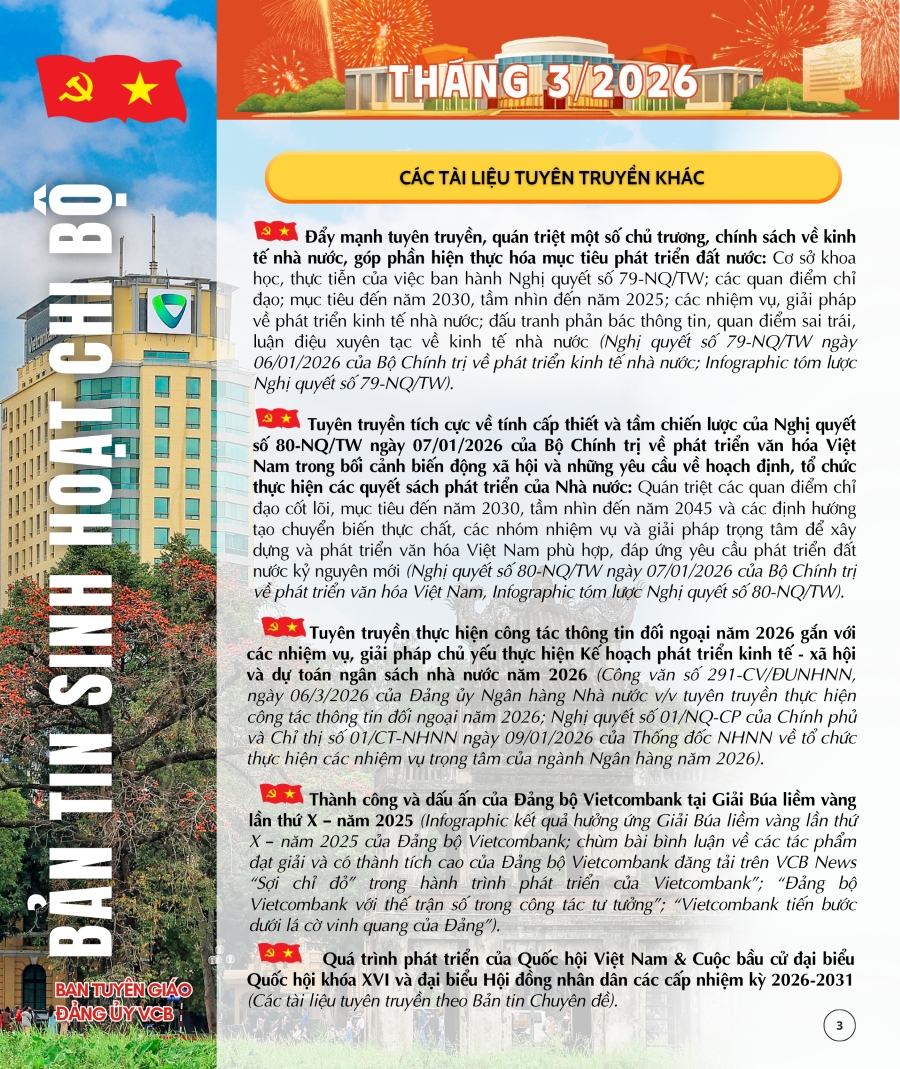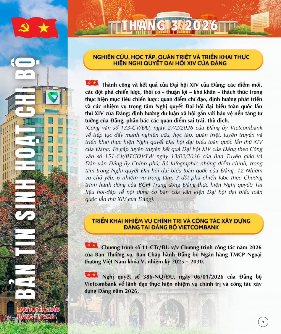 Bản tin sinh hoạt chi bộ tháng 3/2026 do Ban Tuyên giáo Đảng ủy Vietcombank thực hiện. Toàn văn tài liệu được gửi tới Đảng bộ, Chi bộ cơ sở qua hệ thống thông tin nội bộ.