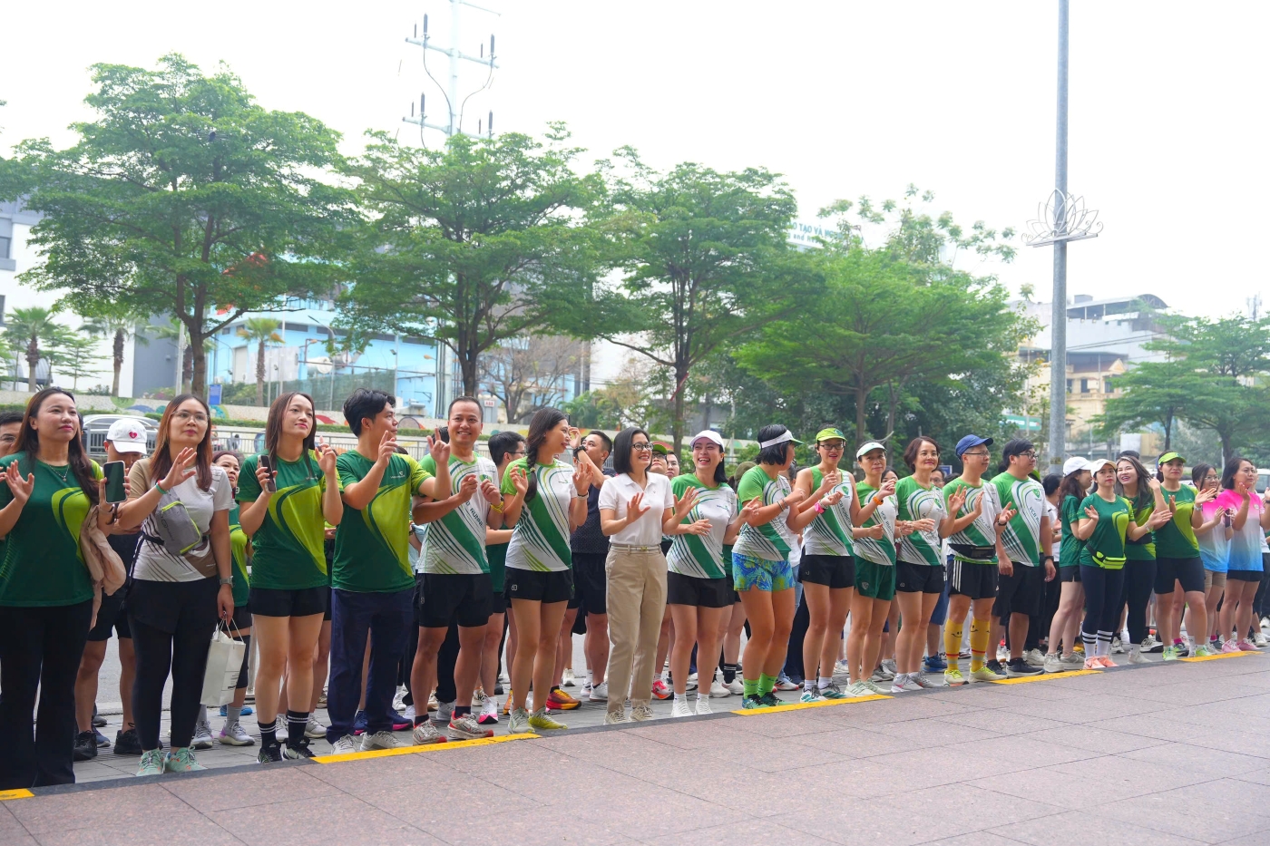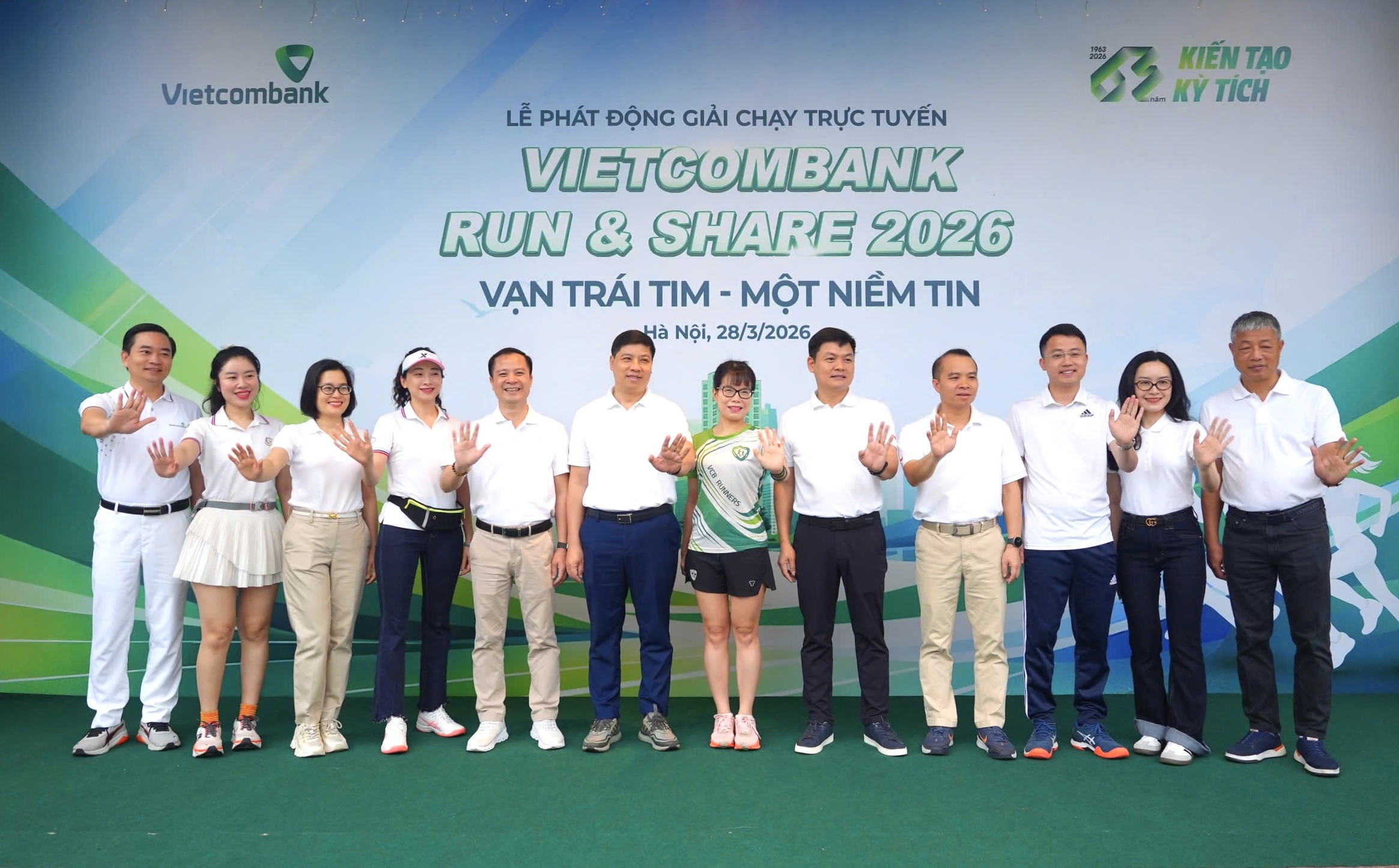 Khoảnh khắc lãnh đạo Vietcombank cùng các đại biểu, khách mời và cán bộ, người lao động đồng loạt giơ cao tay khởi động “Vietcombank Run & Share 2026” – nơi mỗi bước chạy bắt đầu một hành trình sẻ chia