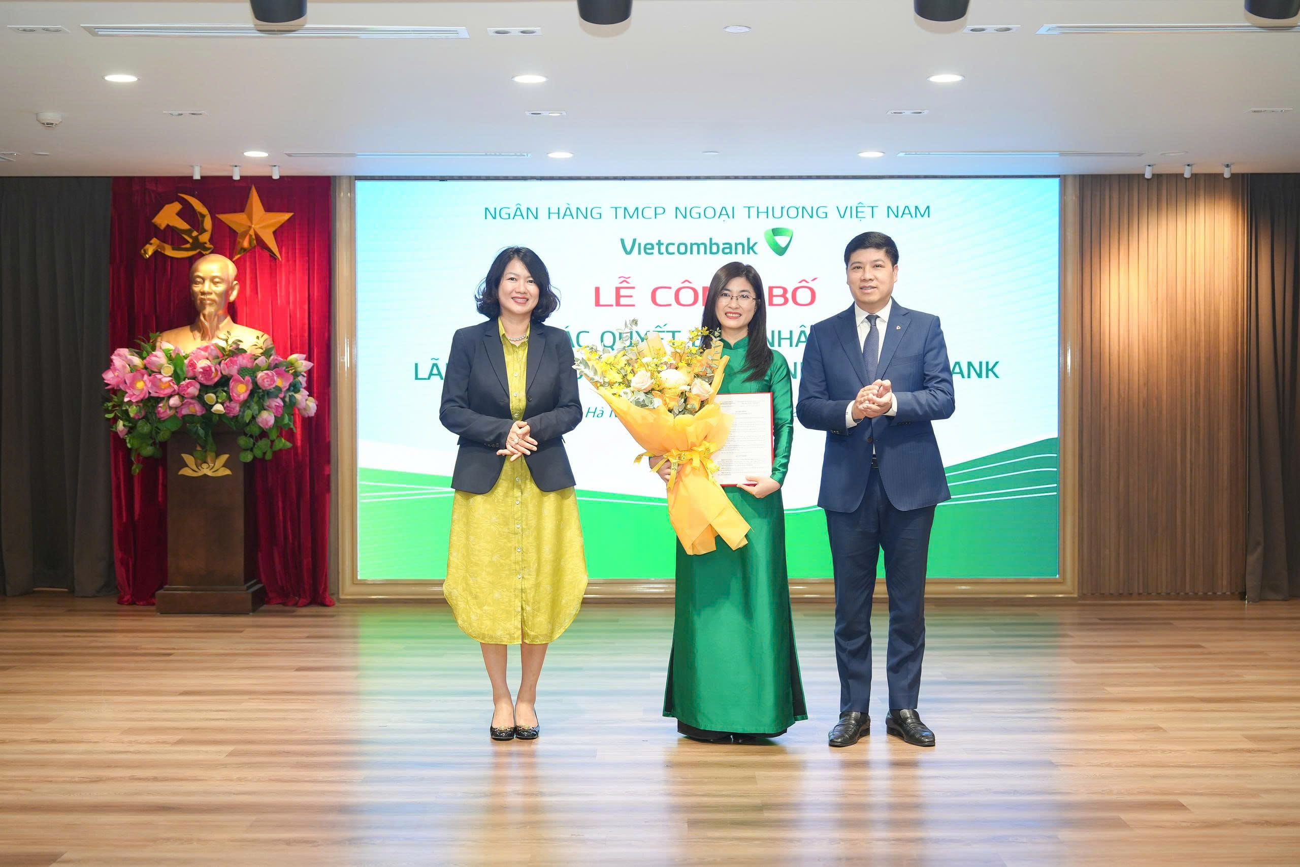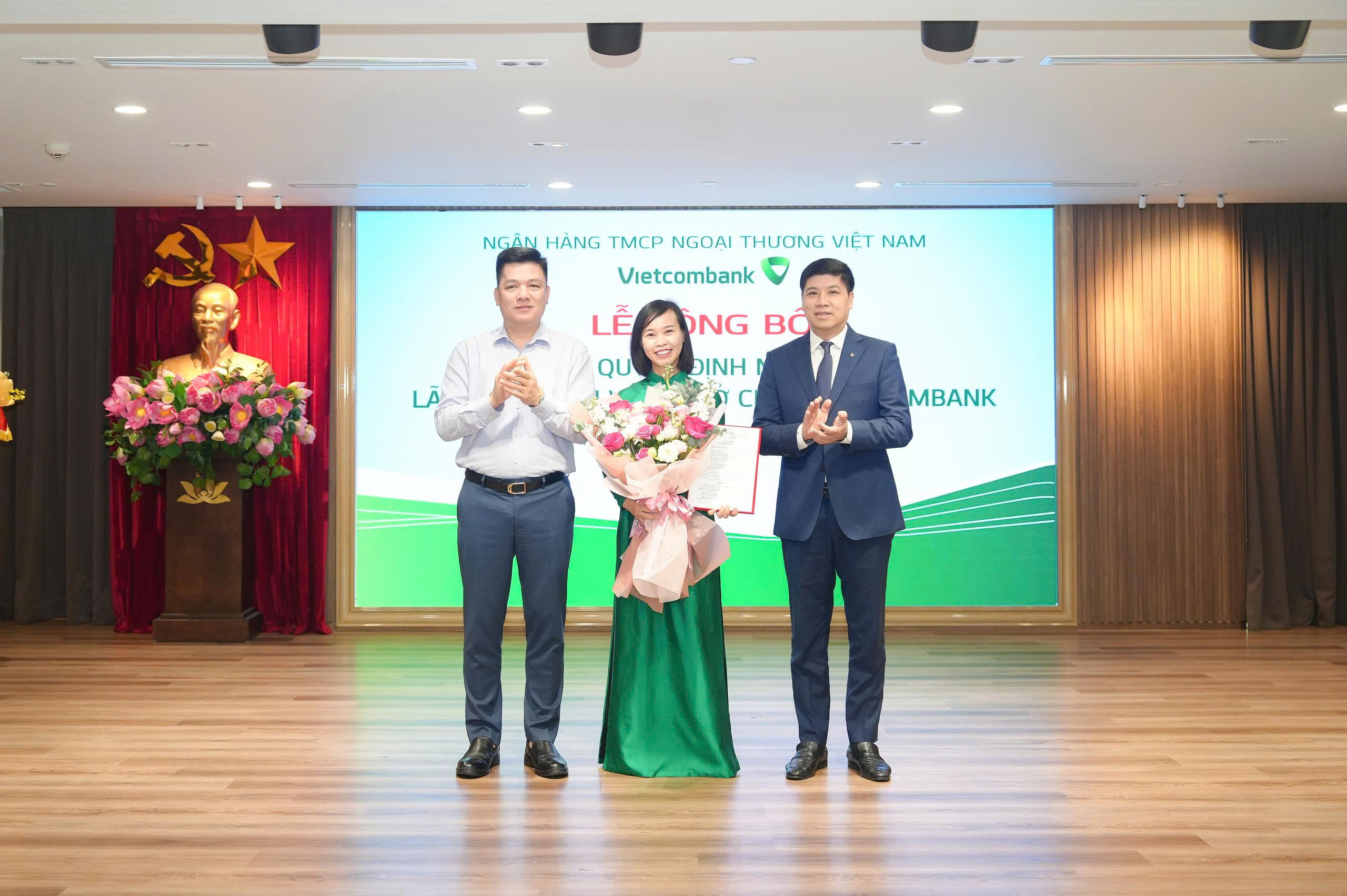 Ông Hồng Quang - Thành viên HĐQT kiêm Giám đốc Khối Nhân sự Vietcombank (bên phải) trao quyết định và bà Nguyễn Thị Hồng Vân - Giám đốc Khối Pháp chế & Tuân thủ (bên trái) tặng hoa chúc mừng bà Nguyễn Thu Hằng - tân Phó trưởng Phòng Quản lý rủi ro tín dụng
