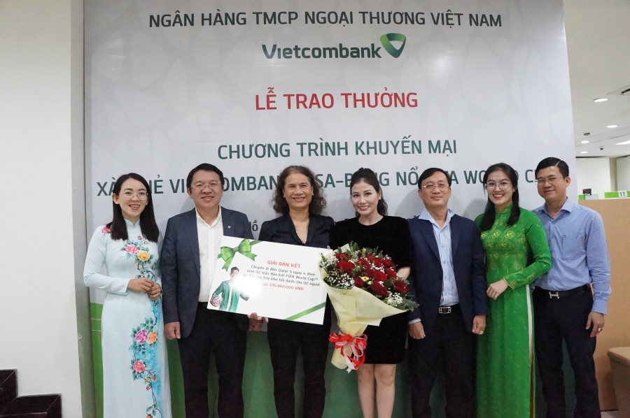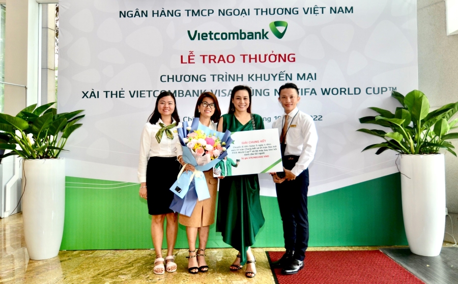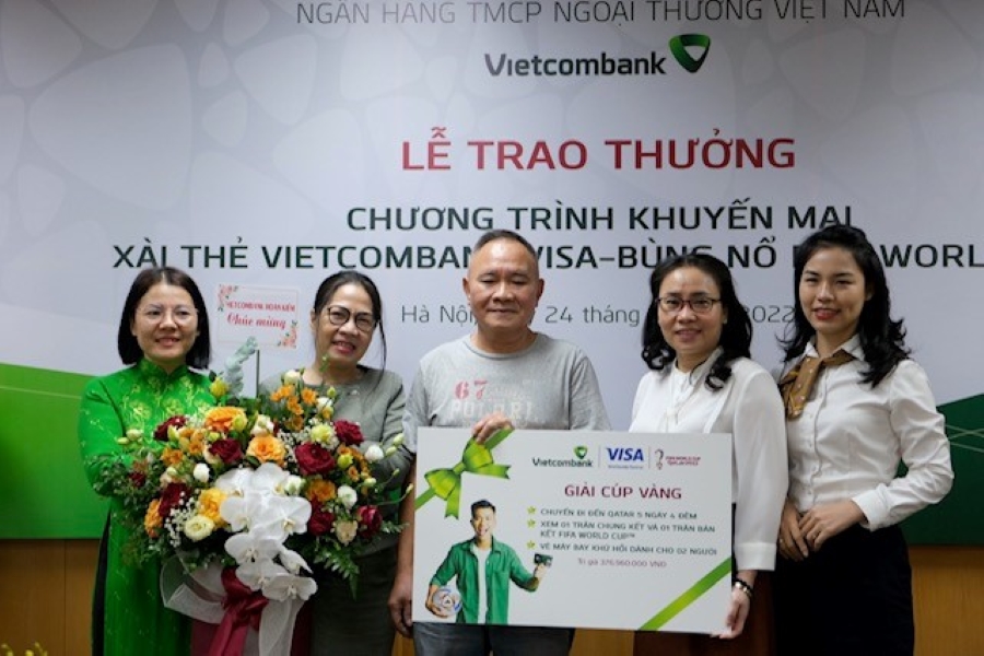Đại diện Vietcombank trao tặng 04 giải thưởng của chương trình Bùng nổ FIFA World Cup cho chủ thẻ Vietcombank Visa hợp lệ: