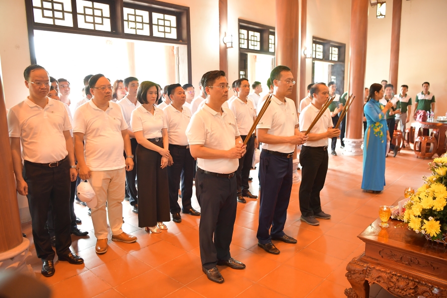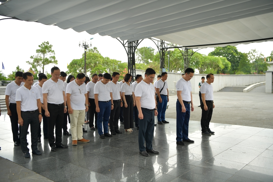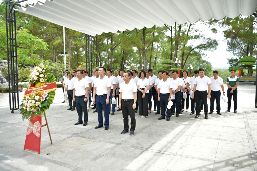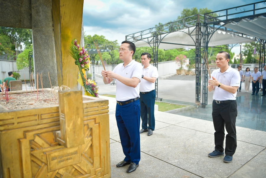Đ/c Phạm Quang Dũng - Ủy viên BTV Đảng ủy Khối DNTW, Bí thư Đảng ủy, Chủ tịch HĐQT (đứng trước) và đ/c Đỗ Việt Hùng – Phó Bí thư thường trực Đảng ủy, thành viên HĐQT (hàng sau, bên phải) cùng đ/c Nguyễn Thanh Tùng – Phó Tổng Giám đốc phụ trách Ban Điều hành (hàng sau, bên trái) kính cẩn dâng hương tri ân các AHLS tại Nghĩa trang liệt sỹ Quốc gia Đường 9