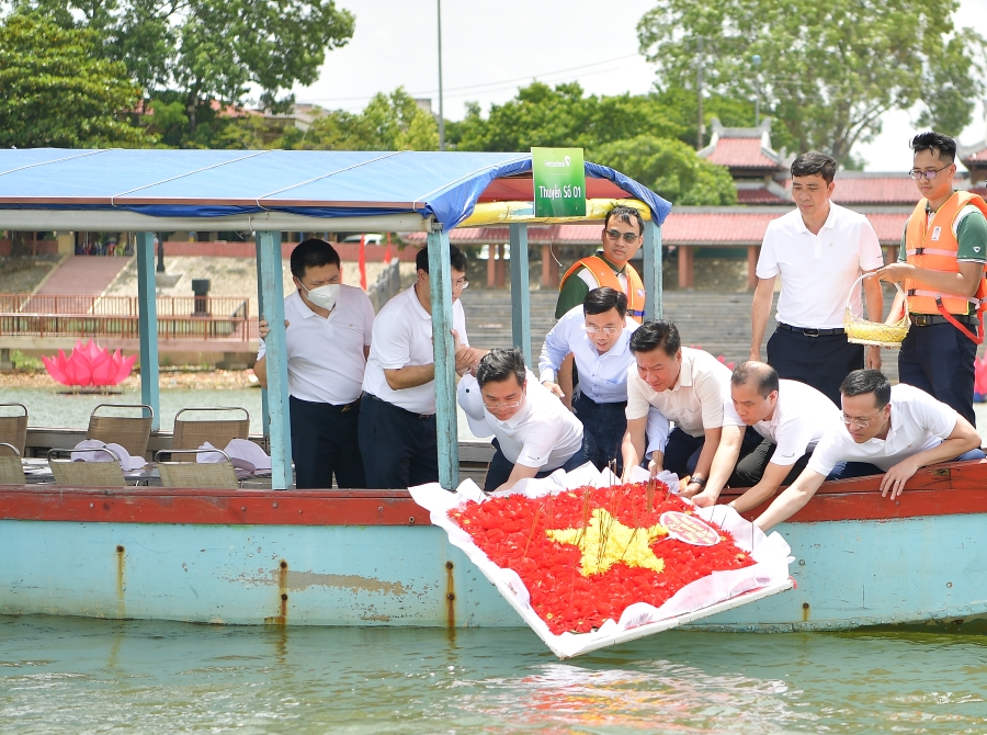 Các đ/c lãnh đạo Vietcombank và lãnh đạo tỉnh Quảng Trị thả hoa tri ân các AHLS trên dòng sông Thạch Hãn