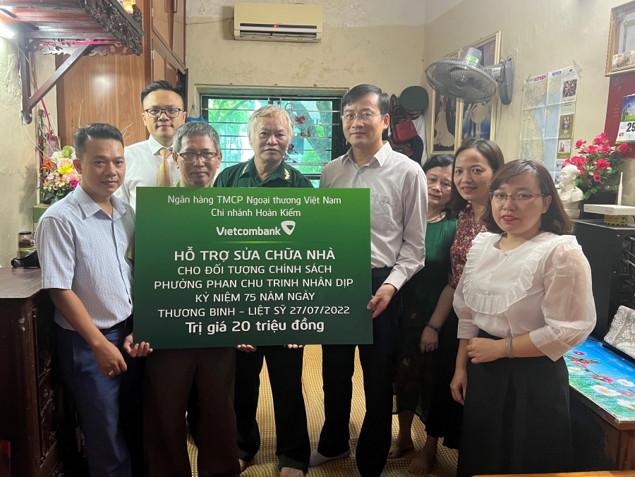 Nhân dịp kỷ niệm 75 năm ngày thương binh - liệt sĩ, với truyền thống “Uống nước, nhớ nguồn”, “Đền ơn đáp nghĩa” của dân tộc, BCH Công đoàn cơ sở đã phối hợp với Đoàn thanh niên Vietcombank Hoàn Kiếm tổ chức thăm hỏi, tặng quà và hỗ trợ chi phí sửa chữa nhà cho gia đình chính sách thương binh Đoàn Văn Hùng với số tiền trị giá 20 triệu đồng.