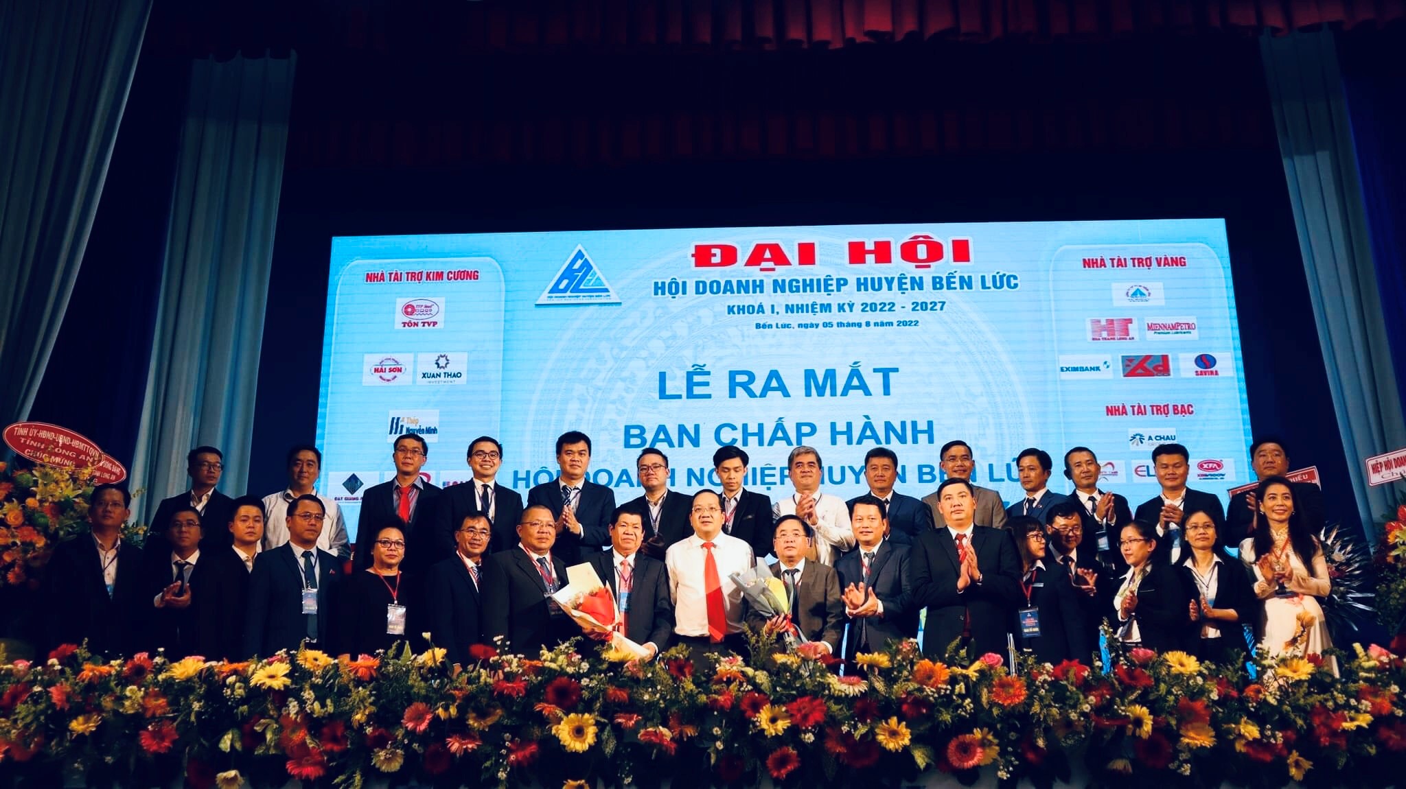 Ông Đoàn Thái Sơn - Giám đốc Vietcombank Long An (hàng thứ 2, thứ 7 từ phải sang) cùng các thành viên BCH Hội Doanh nghiệp huyện Bến Lức khóa I, nhiệm kỳ 2022-2027 ra mắt đại hội